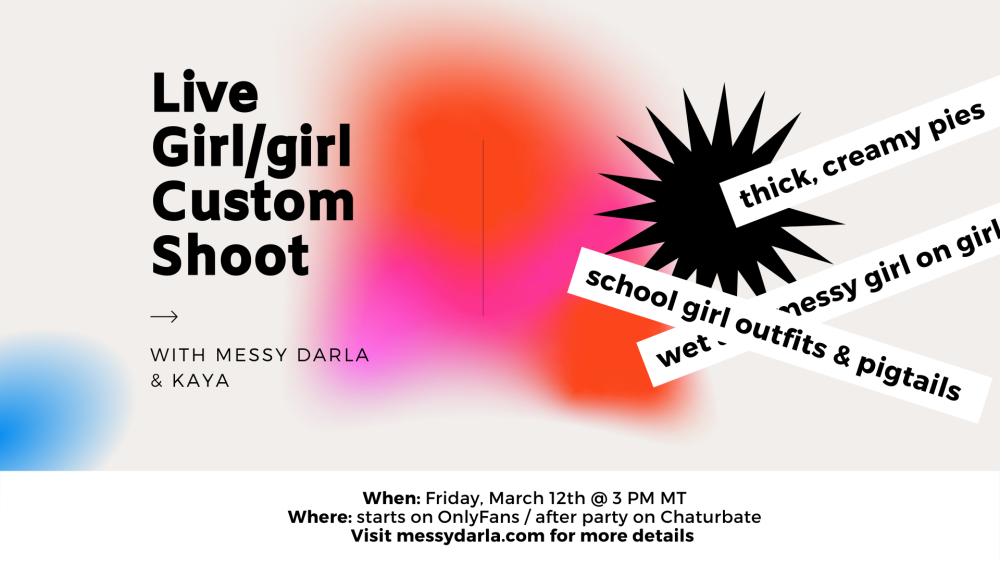 Hi y'all !! Messy D. here. This Friday I'll be hosting a live custom shoot on OnlyFans (onlyfans.com/messydarla) :love: Kaya will be joining me and we'll be in matching school girl outfits pie-ing each other with 20 thick, creamy pies ;-) the shoot will start at 3 PM MT and you all will get a chance to watch the entire thing behind the scenes. I'm currently running a 25% off sale on OnlyFans, so be sure to go snag your sub while the sale lasts !!