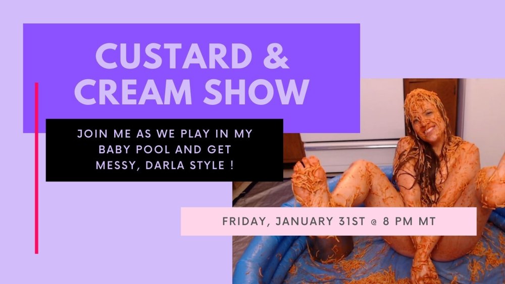 Hi all !! Messy Darla here. I'll be back on Chaturbate this week for a live messy custard show. It will take place on January 31st at 8 pm MT. I'll be online from 9-2 am and will be playing in my baby pool with custard! It will be my first time doing custard play and I literally cannot wait to get drenched. I hope you'll join me :)